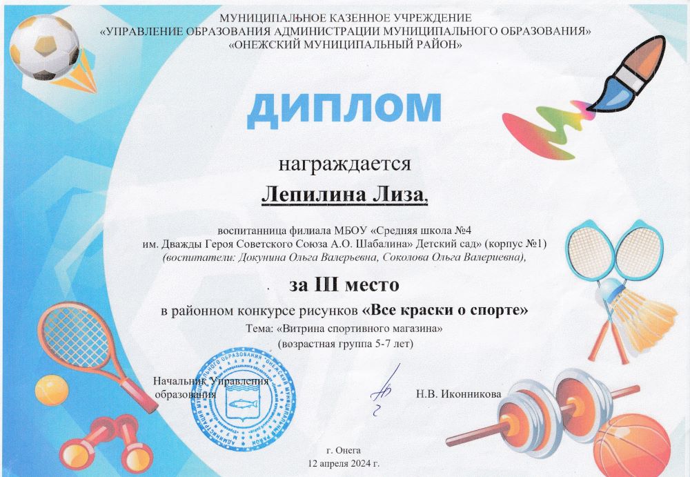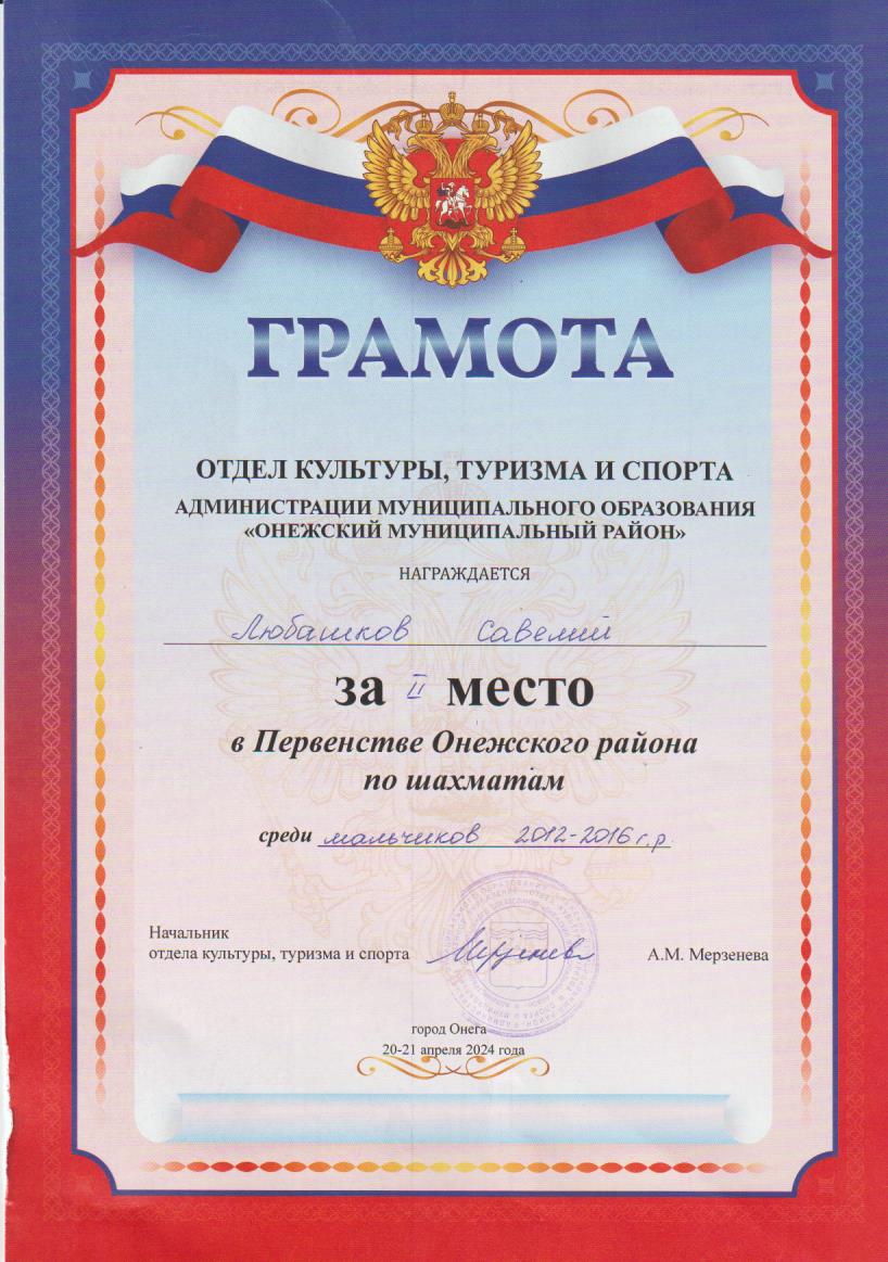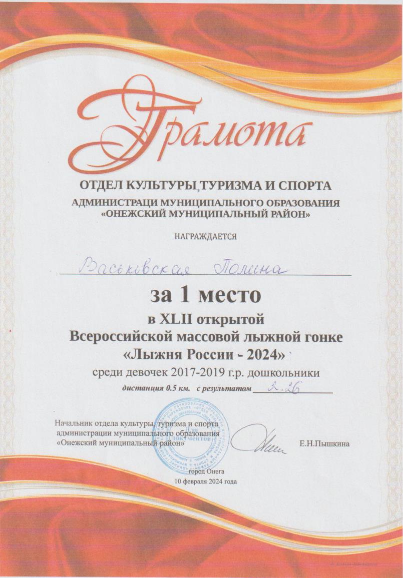 Награждается Васьковская Полина занявшая 3 место в соревнованиях по лыжным гонкам "Снеговичок 2024"среди воспитаннико...