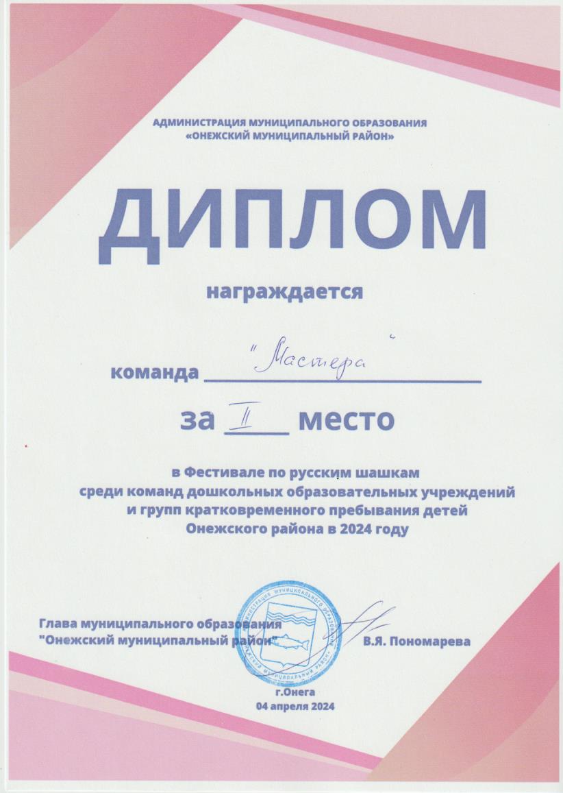Команде "Мастера"в фестивале по русским шашкам среди команд ДОУ и групп кратковременного пребывания детей Онежского р...