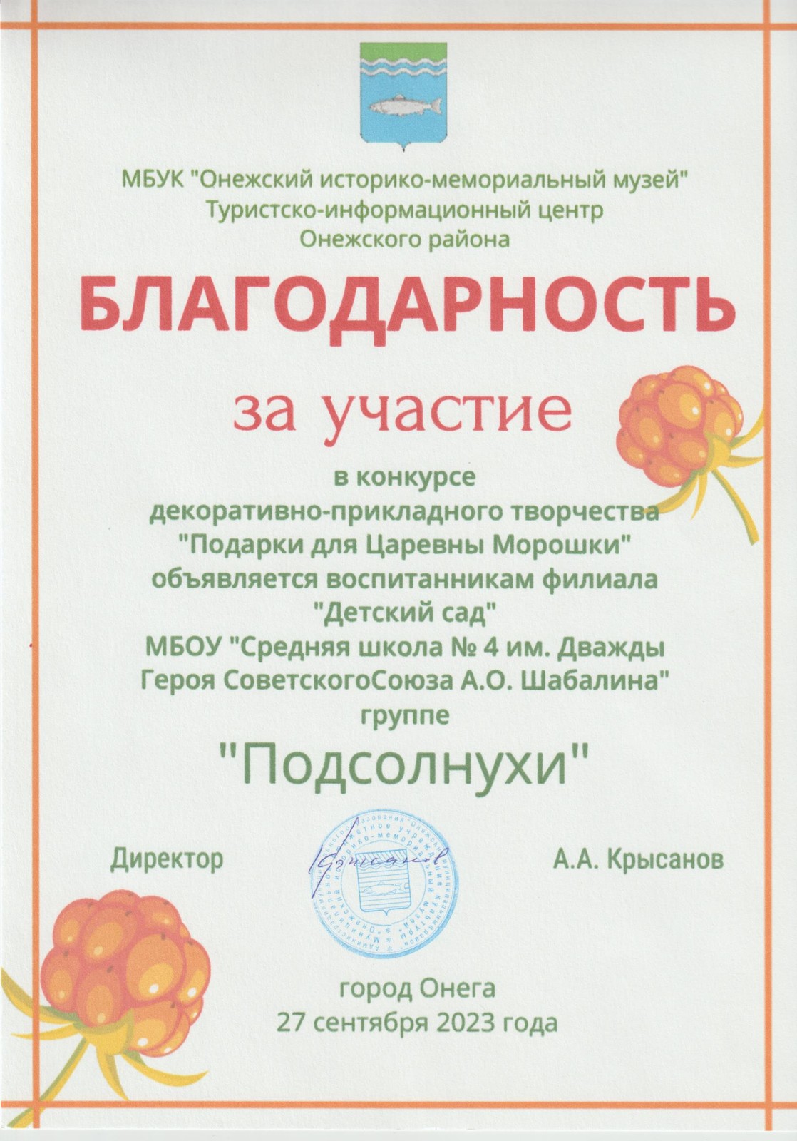 гр."Подсолнухи"за участие в конкурсе декоративно-прикладного творчества "Подарки для Царевны "Морошки"