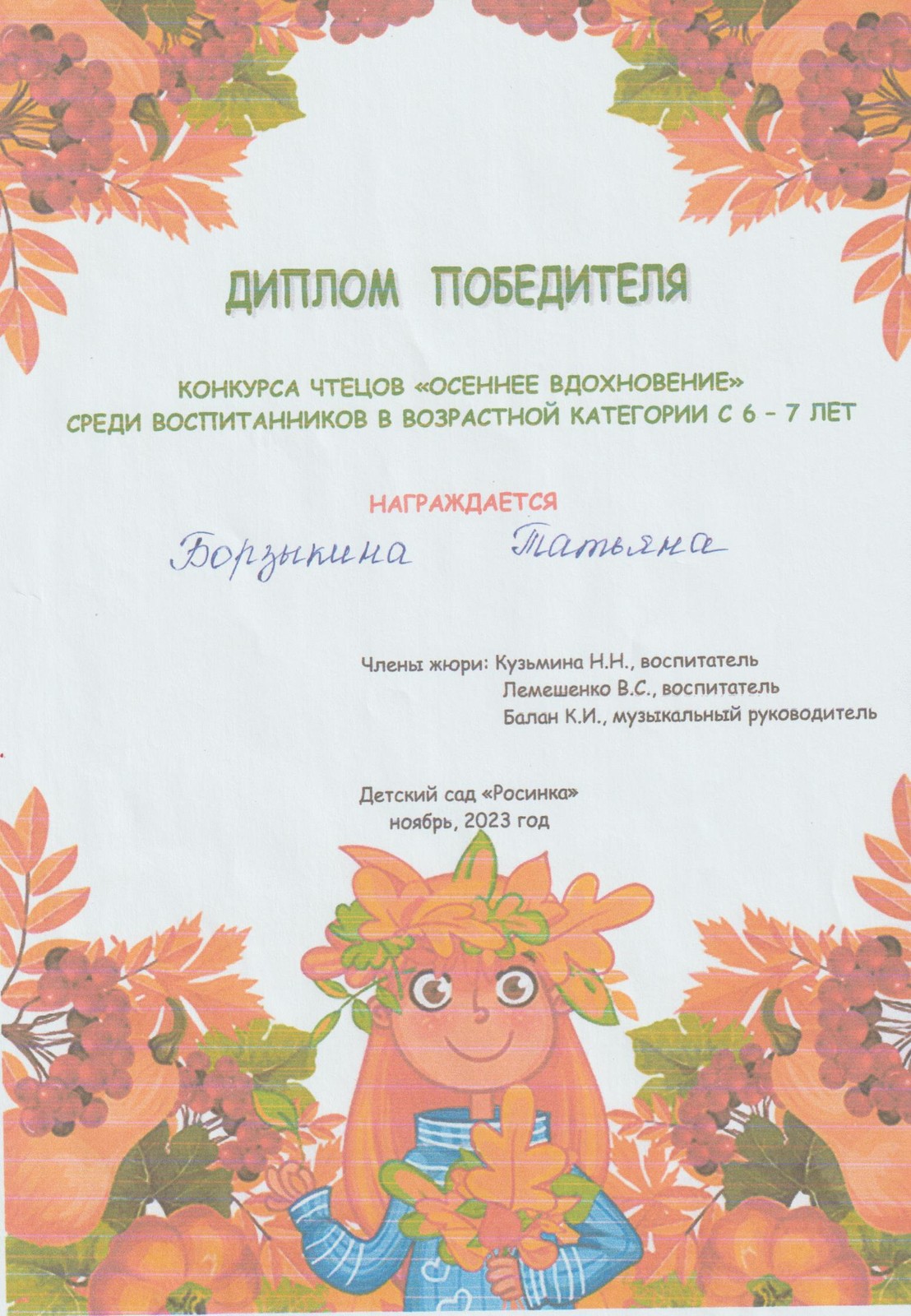 Борзыкиной Татьяне за победу в конкурсе чтецов "Осеннее вдохновение"