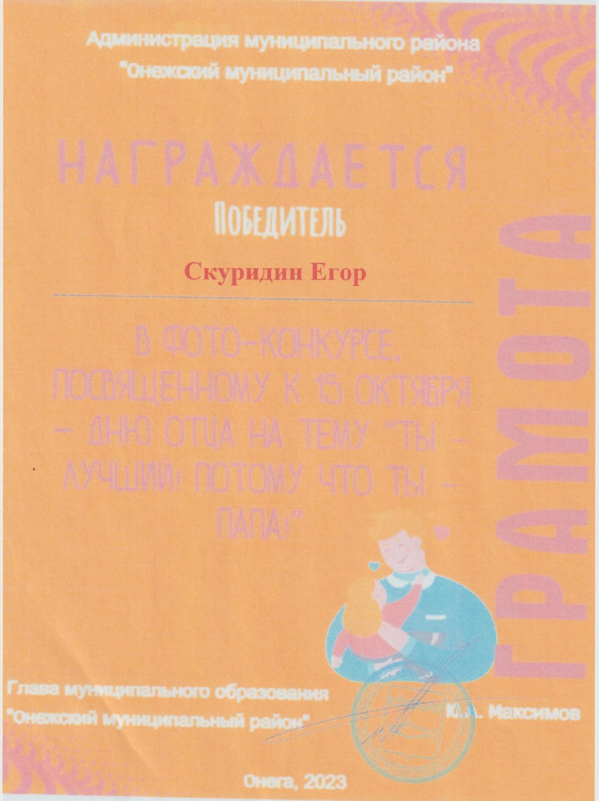 Скуридину Егору за 1 место в районном фото-конкурсе к Дню отца