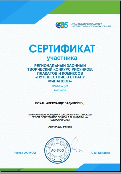 Бохан Александр,участник регионального заочного творческого конкурса рисунков и плакатов "Путешествие в страну Финансов"