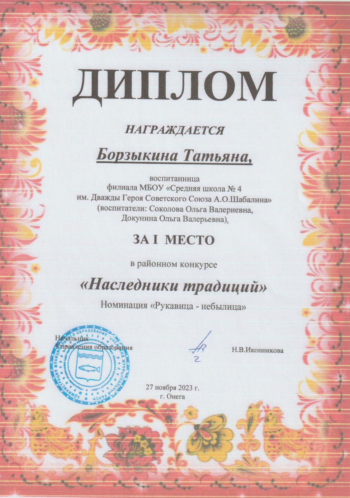 Борзыкиной Татьяне за 1 место в районном конкурсе "Наследники традиций"