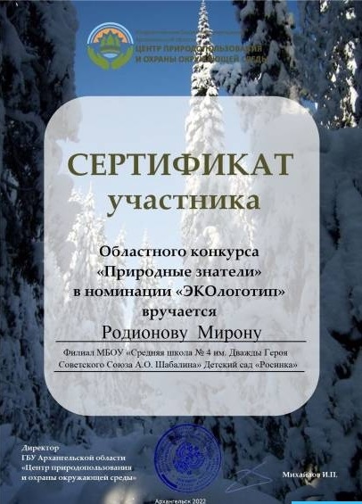 Родионову Мирону,участнику обласного конкурса "Природные знатели"