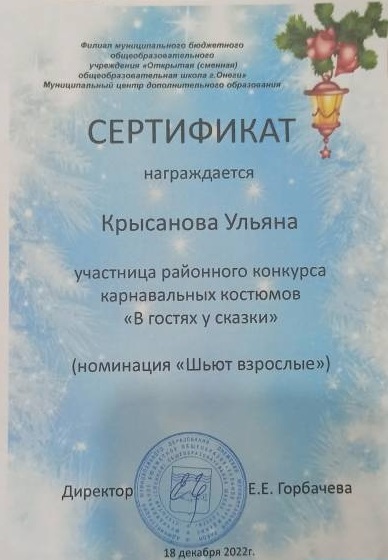 Крысанова Ульяна,участница районного конкурса карнавальных костюмов "В гостях у сказки"