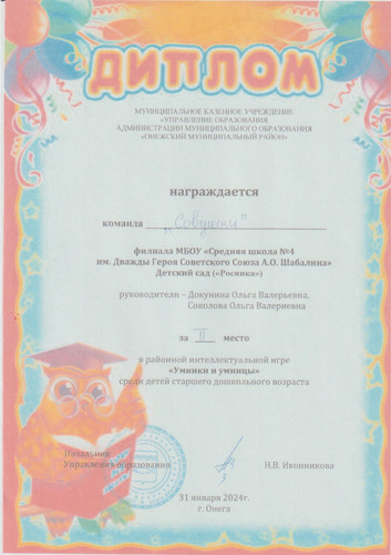 За 2 место команде "Совушки" в районной интеллектуальной игре.