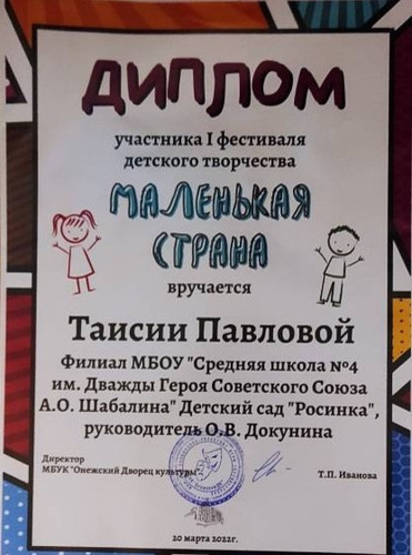 Таисии Павловой,участнику 1 Фестиваля детского творчества "Маленькая страна"