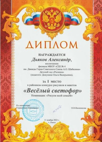 Дьяков Александр за 1 место в районном конкурсе рисунков и макетов "Весёлый светофор"