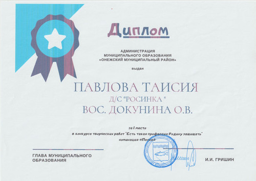 Павлова Таисия за 1 место в районном конкурсе"Есть такая профессия Родину защищать"