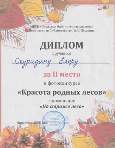 Скуридину Егору за 2 место в районном фотоконкурсе "Красота родных лесов"