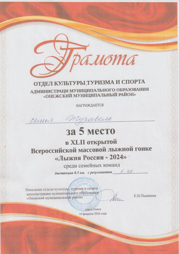 Семье Журавель за 5 место в открытой Всероссийской массовой лыжной гонке "Лыжня России - 2024"