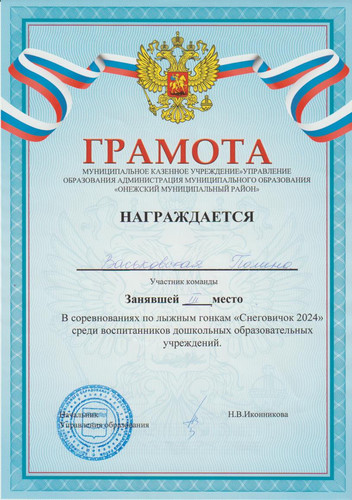 Награждается Васьковская Полина занявшая 3 место в соревнованиях по лыжным гонкам "Снеговичок 2024"среди воспитанников дошкольных образовательных учреждений