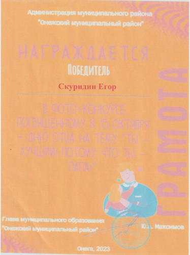 Скуридину Егору за 1 место в районном фото-конкурсе к Дню отца