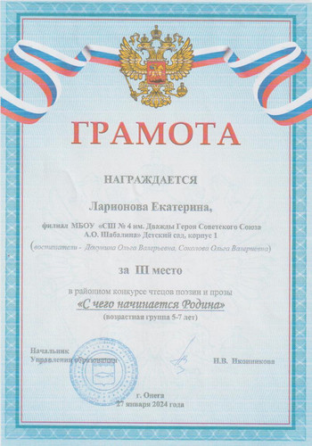 Ларионовой Кате за 3 место в районном конкурсе чтецов поэзии и прозы "С чего начинается Родина"