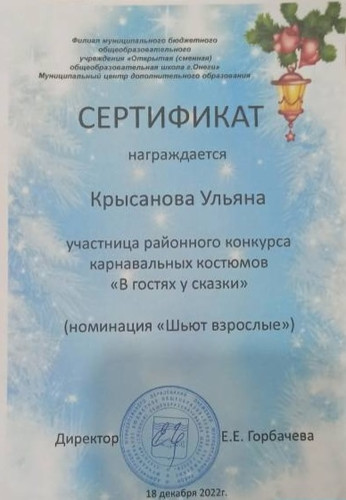 Крысанова Ульяна,участница районного конкурса карнавальных костюмов "В гостях у сказки"