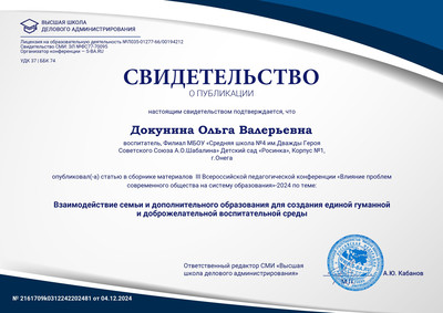 Публикация статьи в сетевом информационно-методическом журнале АО ИОО "Северная Двина" (январь 2023 г.) Данная статья освещает опыт работы ДОУ по формированию партнерских взаимоотношений с учреждениями культуры города